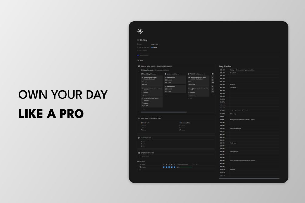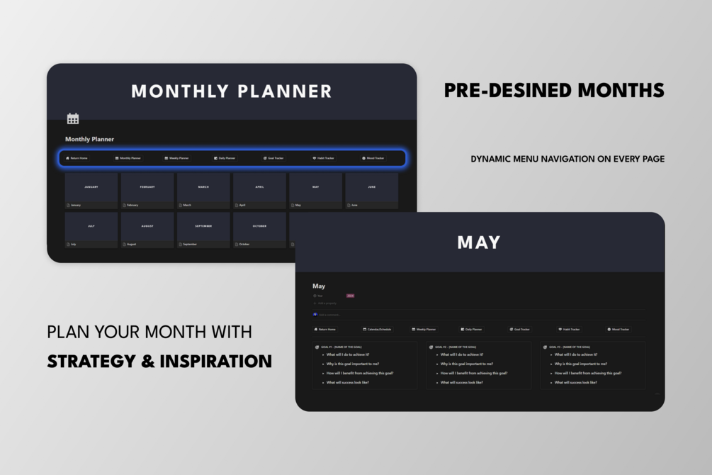 Notion Goal Planner Template: Monthly, Weekly, and Daily Planners to keep you organized and focused + actionable trackers to monitor your progress.